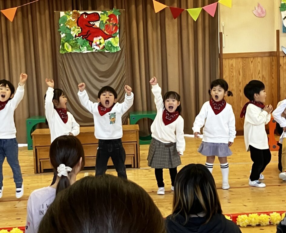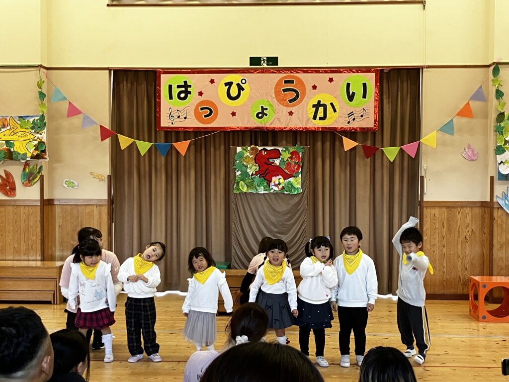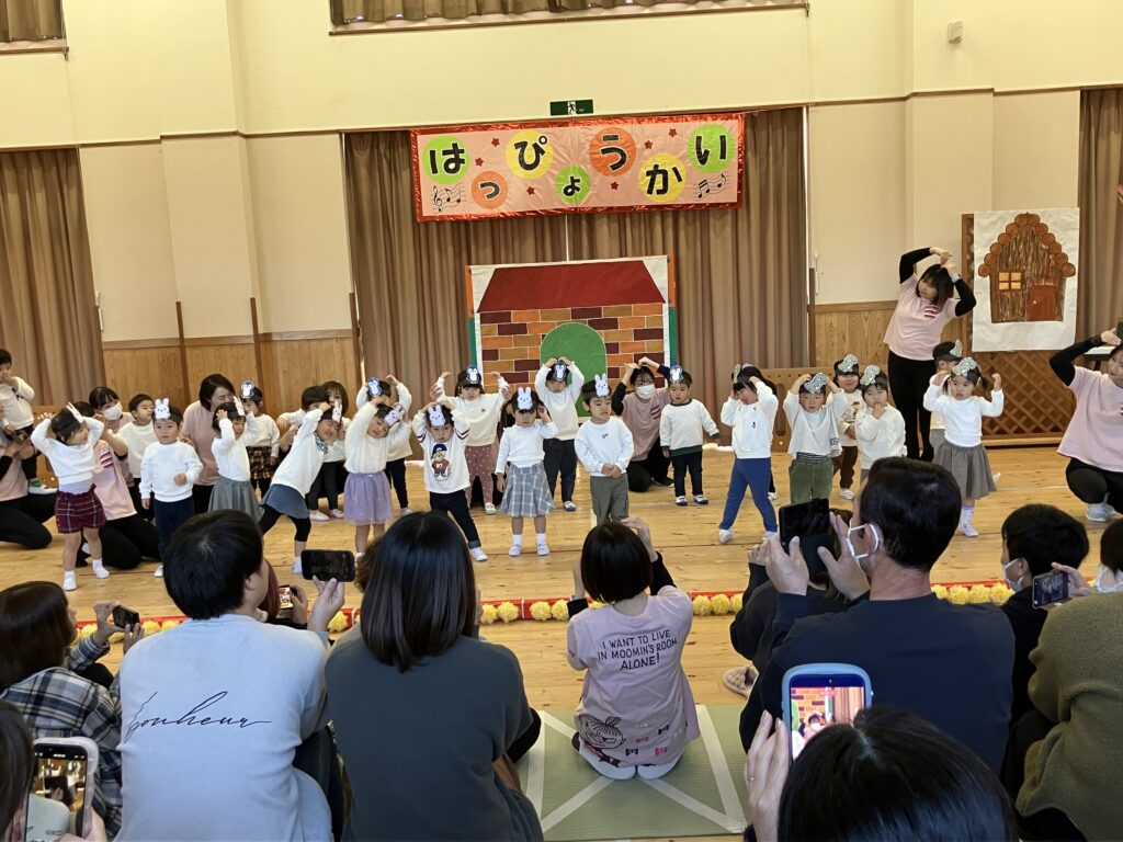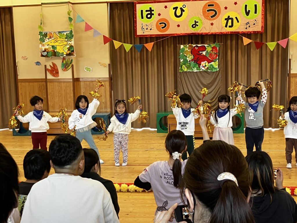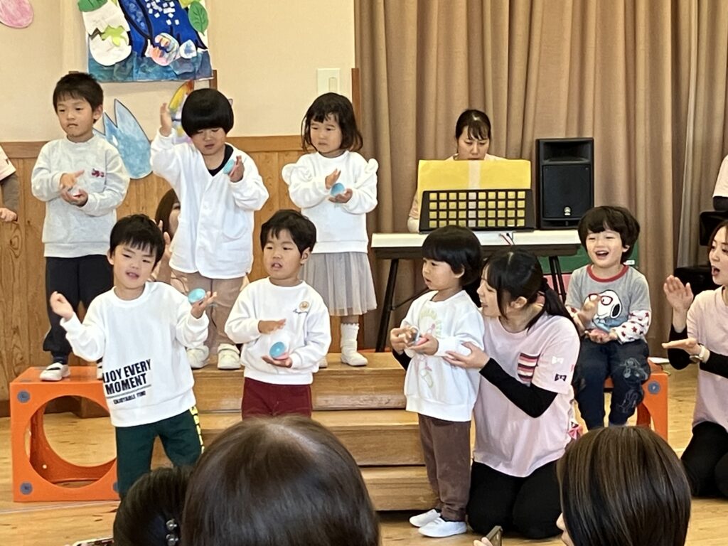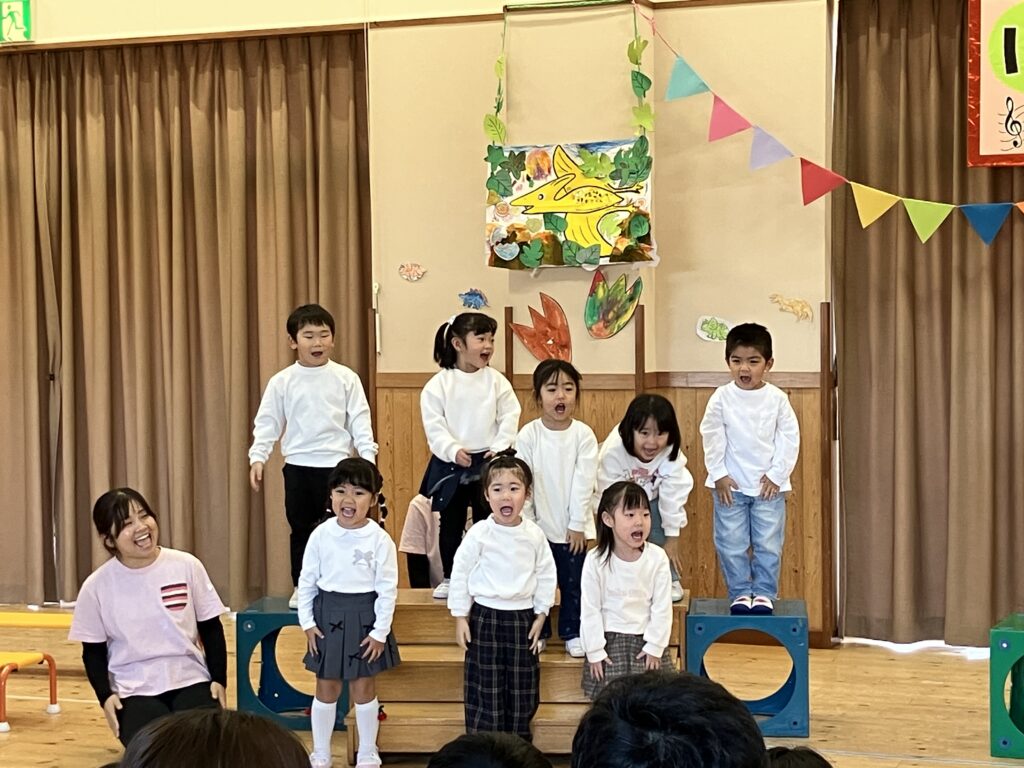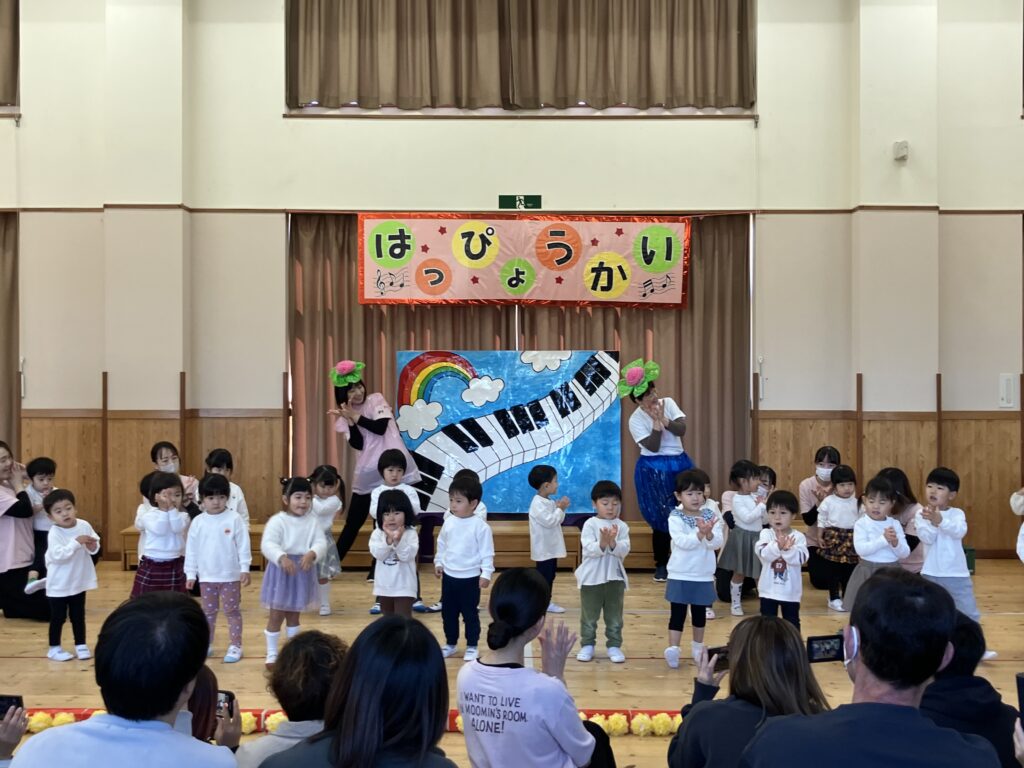 日頃から親しんでいる好きなあそびや歌、手遊び、様々な活動を取り入れた発表となり、一人ひとりが楽しみながら、のびのと表現することができました。