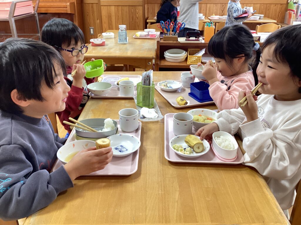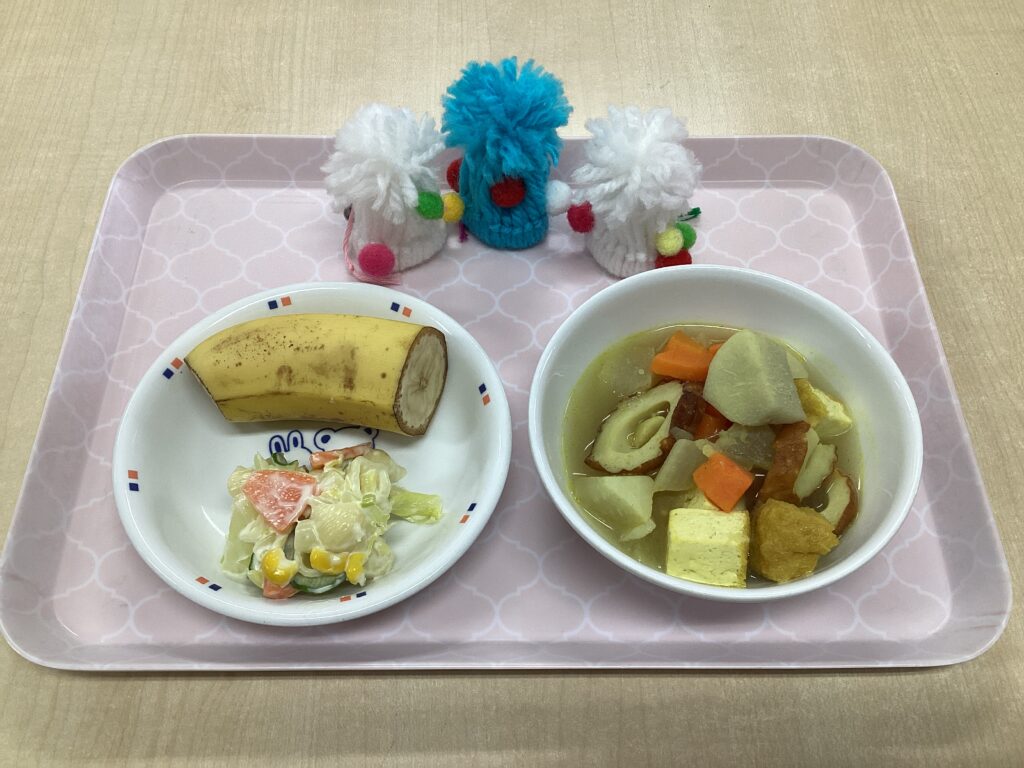 12月オリジナルメニュー 2026/01/22 12月オリジナルメニュー「ぽかぽかの日」 ・カレーおでん ・マカロニサラダ ・バナナ おでんの出汁にカレー粉を加え、カレー風味のおでんにしました! おでんには里芋、大根、人参、じゃが芋、厚揚げ、焼き竹輪を入れました。 寒い時期は体を温めることで、風邪をひきにくくするといわれています。 心も体もぽかぽかにして、寒い冬を乗り越えましょう!