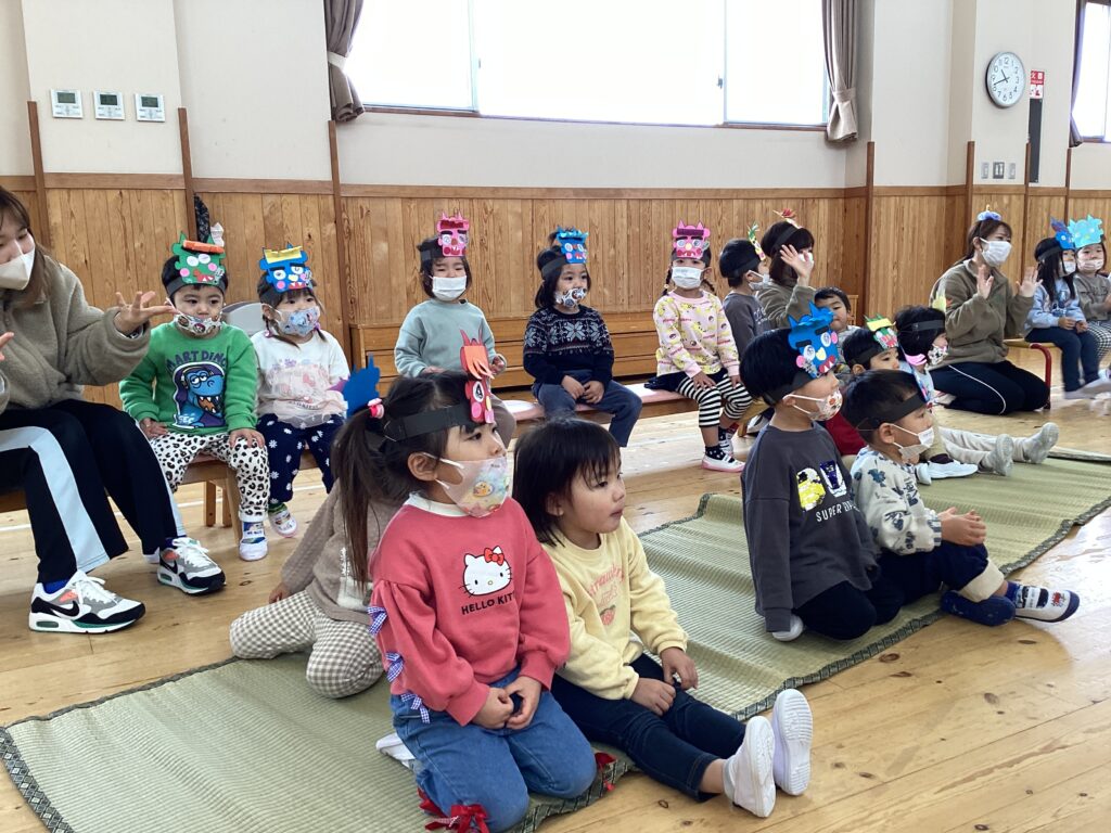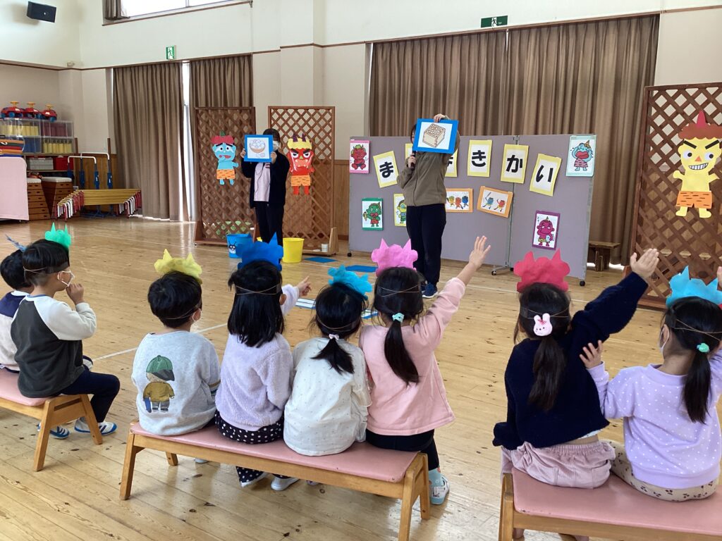 節分クイズをしたよ。子どもたちなりに知っている知識を手をあげて発表していました。