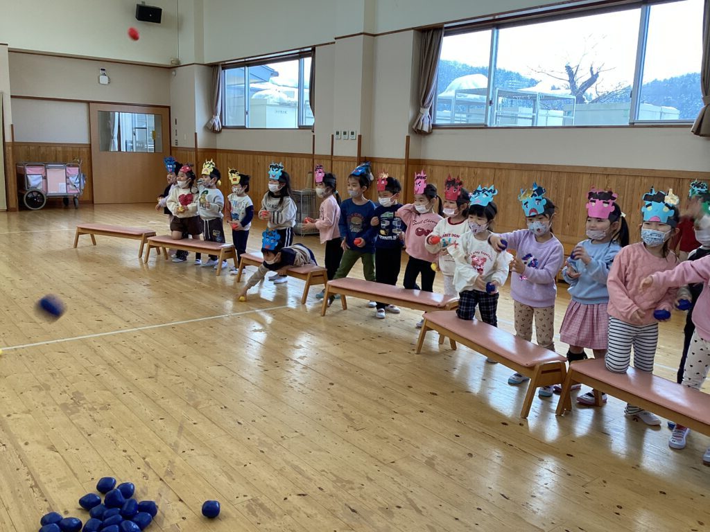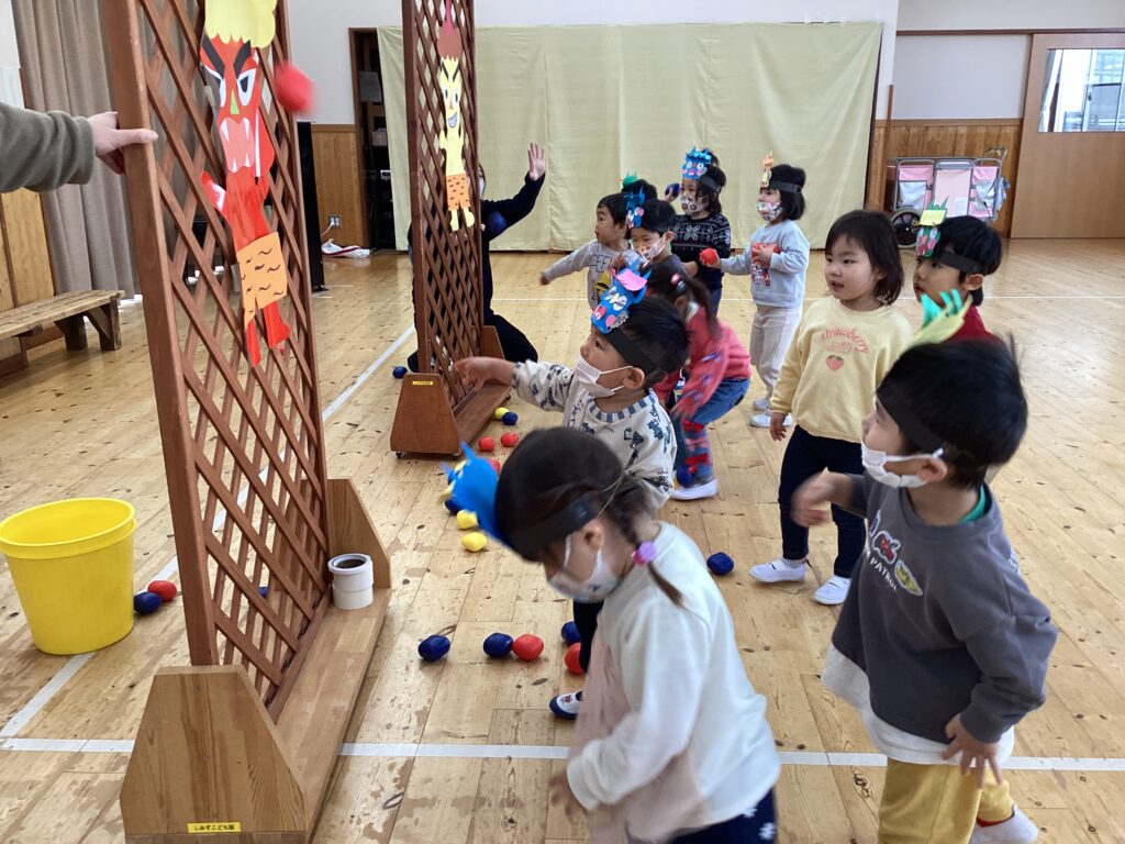 「イヤイヤ鬼」「なきむし鬼」「いたずら鬼」みんなの心の中にはどんな鬼がいるかなと振り返って的当てで豆まきしたよ。