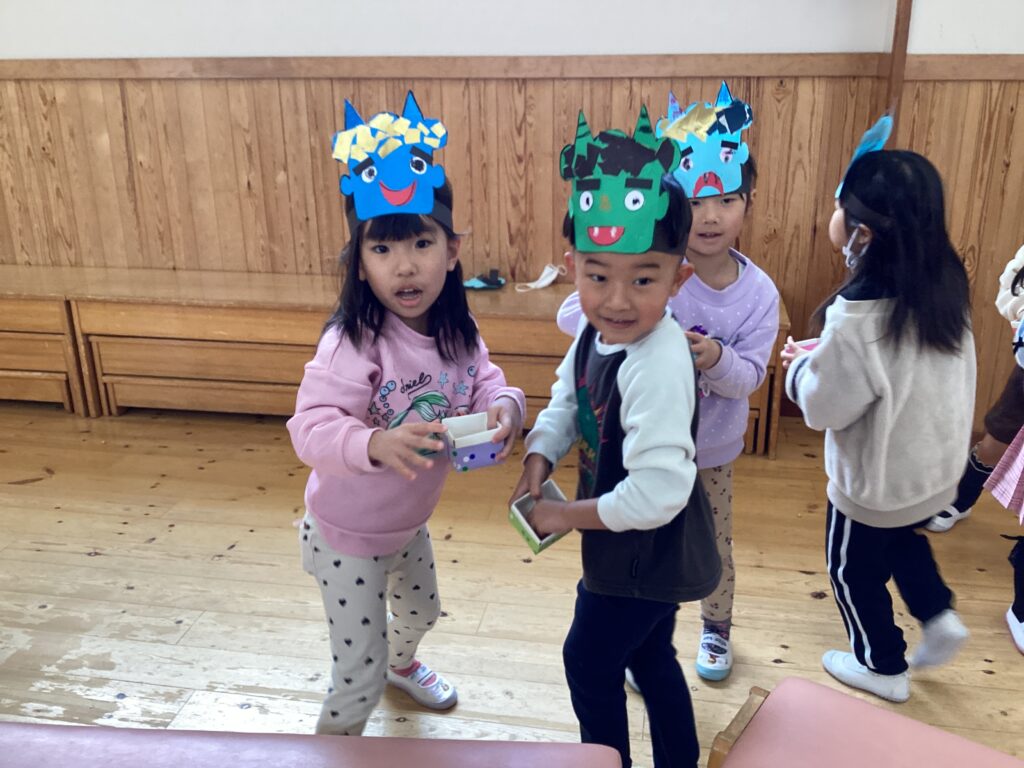4歳児からは本物の豆で豆まきをしました。鬼に立ち向かう子、走って逃げる子、保育者のうしろに隠れる子様々な姿をみせながらもみんなで頑張ってやっつけていました。