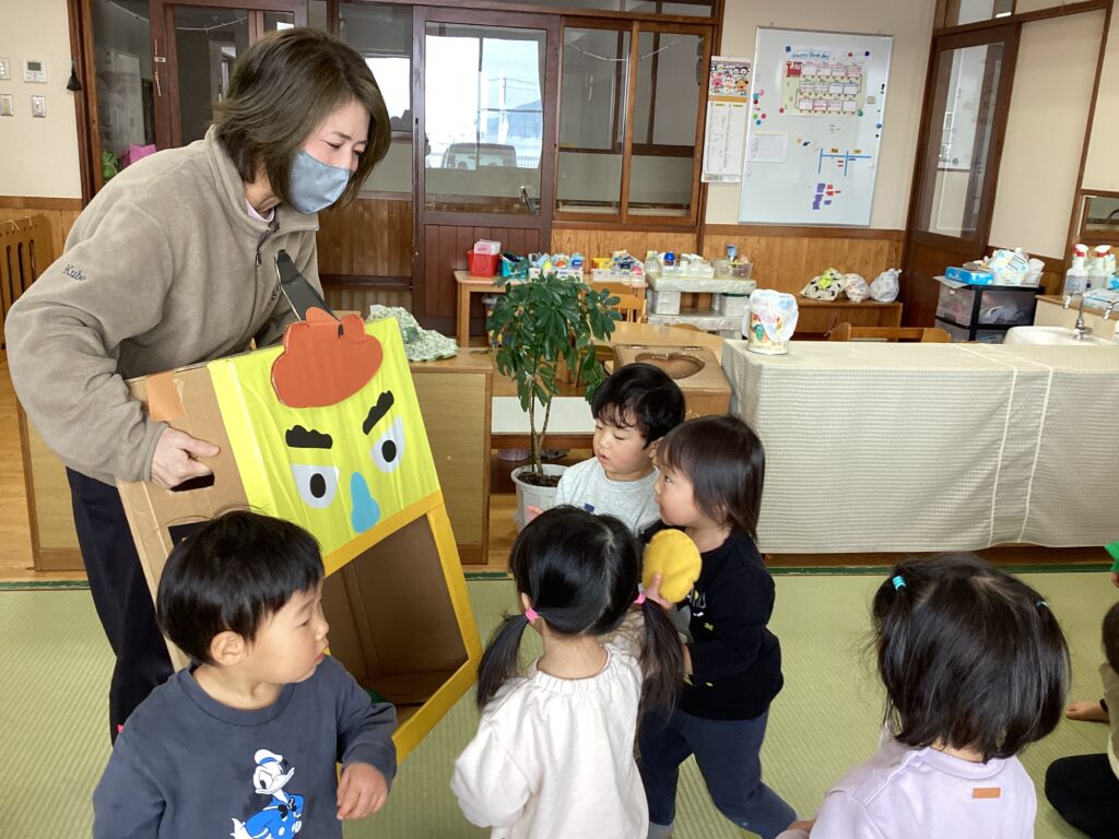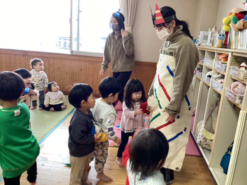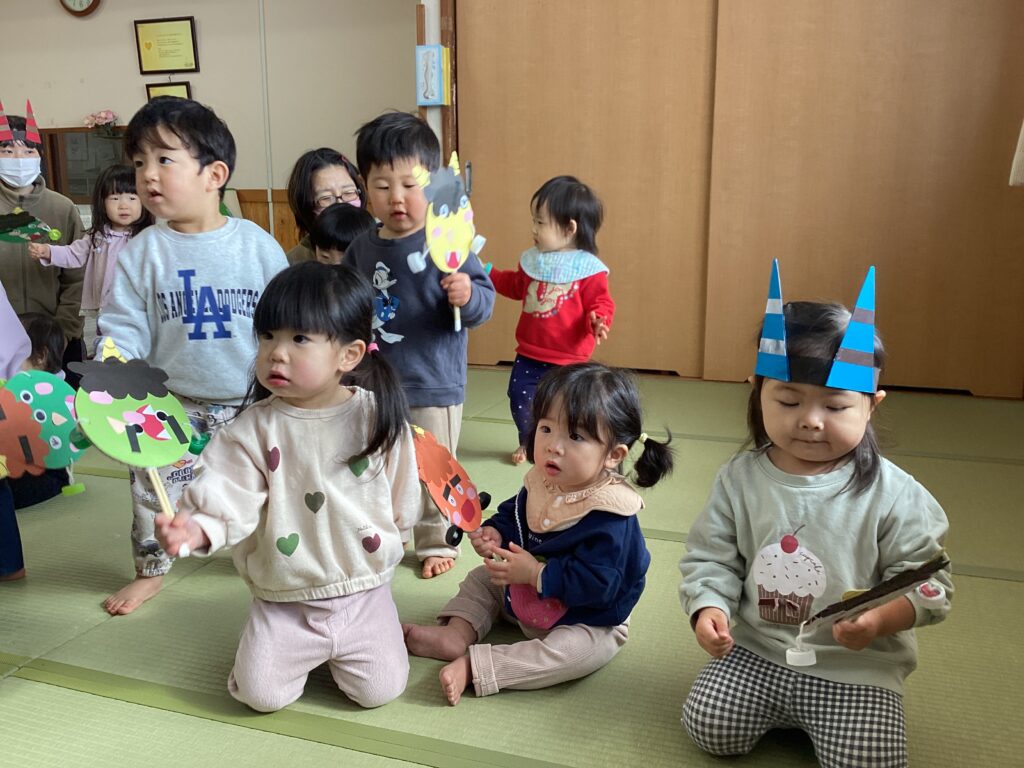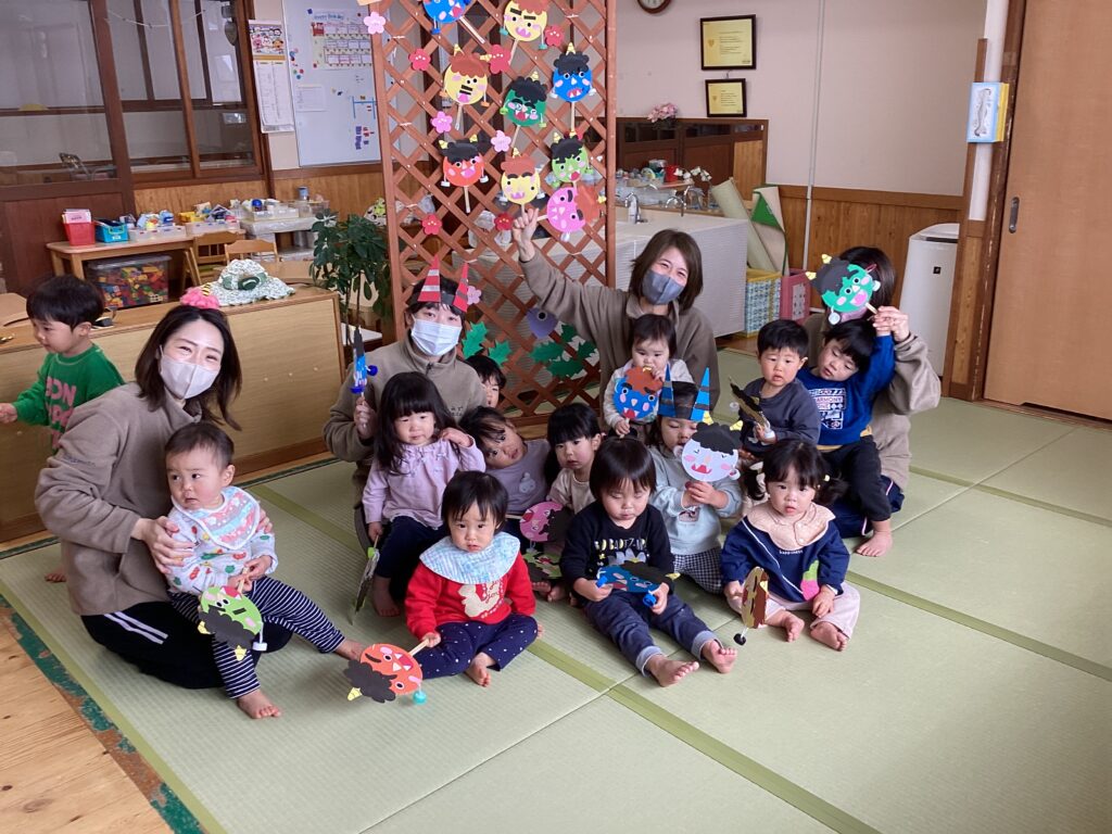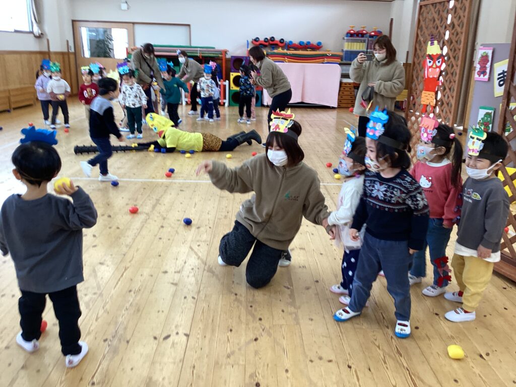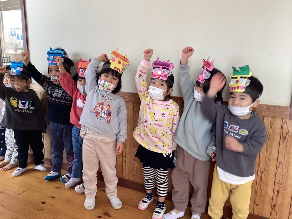各年齢ごとに保育者や友達と一緒に節分の由来を聞いたり、厄を払いながら豆まきをしました。
