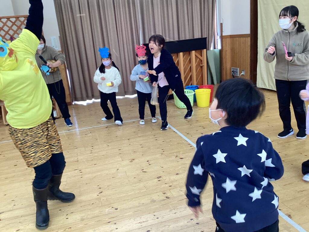 やっぱり本物の鬼はびっくりするね!でも、頑張って豆を投げて戦っていました。